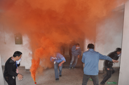 演練開始,信號(hào)組在得到演練命令后,立即發(fā)出火警訊號(hào)。同時(shí)在各個(gè)指定點(diǎn)放啟煙霧彈,樓梯道和走廊瞬間濃煙滾滾,各演練組在聽到逃生訊號(hào)后,在逃生組長(zhǎng)的的組織下,迅速有序地從車間里往車間外疏散,每人用濕毛巾捂住嘴巴,彎腰匍匐前進(jìn),按規(guī)定的順序出了車間后分別從中線(沿樓梯道)和南線(沿走廊)繼續(xù)疏散,最后沖出煙區(qū)。救援組的人員跟隨疏散途中搶救了一名受傷人員(專人份演),在煙霧中,他們抬著擔(dān)架將傷員救出,到達(dá)指定地點(diǎn)集中,最后一名員工到達(dá)指定集合地點(diǎn)的時(shí)間是1分17秒。