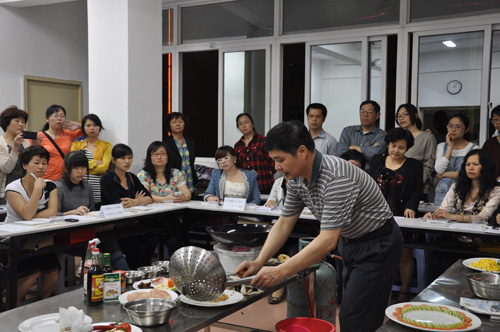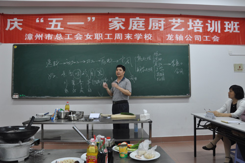 從2014年4月21日起,每逢周一晚上,公司幾十名廚藝愛(ài)好者都會(huì)興致勃勃地聚集在漳州市總工會(huì)職工業(yè)余學(xué)校,一起認(rèn)認(rèn)真真地學(xué)習(xí)廚藝,捧著筆記本仔細(xì)記下授課老師講解的做菜要點(diǎn),睜大眼睛盯著授課老師的現(xiàn)場(chǎng)操作,從烹飪的基礎(chǔ)知識(shí)、刀功的基本要領(lǐng)、配菜的基本方法到一道道葷素搭配、家??梢?jiàn)的美味佳肴如芝麻雞、排糖醋肉、紅燒魚(yú)塊、椒鹽海蠣、松仁玉米、沙司茄子等,都生怕落下一個(gè)小小的細(xì)節(jié)……