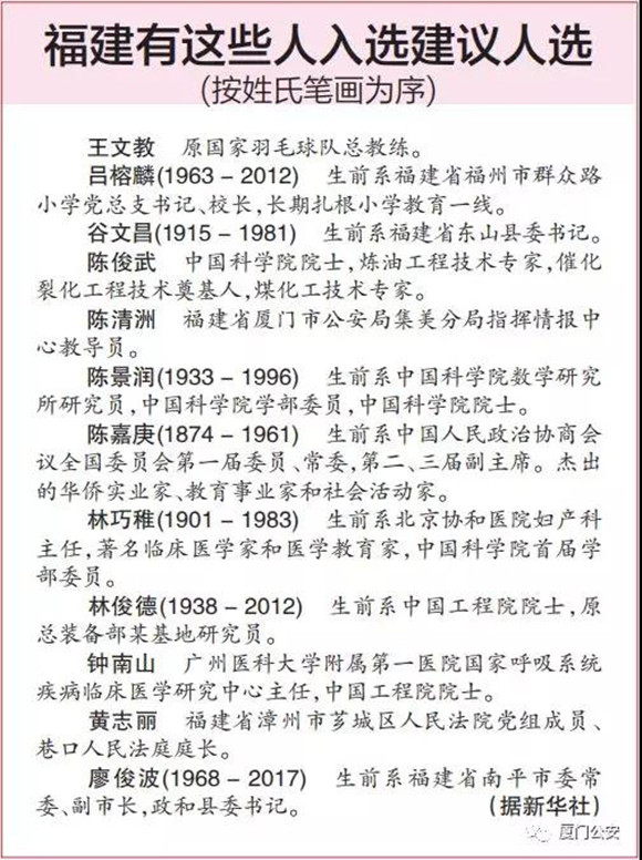 ????在前期的遴選推薦、群眾網上投票、組委會集中審議、中央和國家機關有關部門認真審核下,組委會于9月15日公示了300名“最美奮斗者”建議人選名單。其中,“時代楷?!?、全國公安系統(tǒng)一級英模、廈門市公安局民警陳清洲和漳州市薌城區(qū)人民法院黨組成員、巷口人民法庭庭長黃志麗榜上有名。同時,福建共有12人入選建議人選名單。