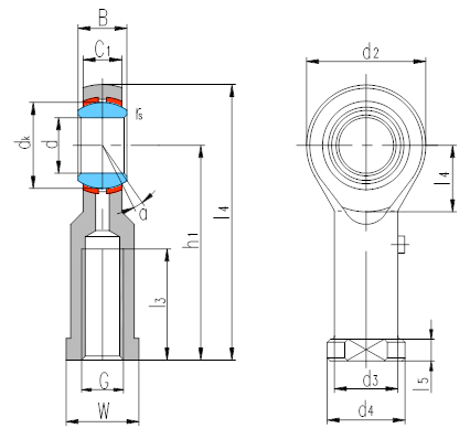 產品特點:鑲墊桿端關節(jié)軸承桿端體材料是碳鋼,表面鍍鋅,滑動表面鑲入青銅襯墊;內圈材料是軸承鋼,淬火,球面鍍硬鉻,除了孔徑小于6.35外,其余均可通過油杯潤滑。