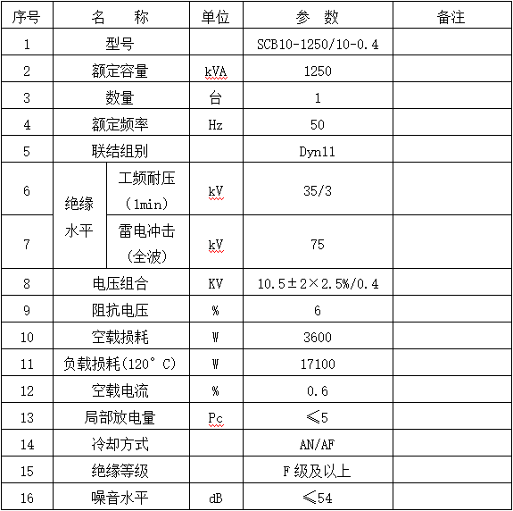 1250kVA干式變壓器的技術協(xié)議內(nèi)容要求