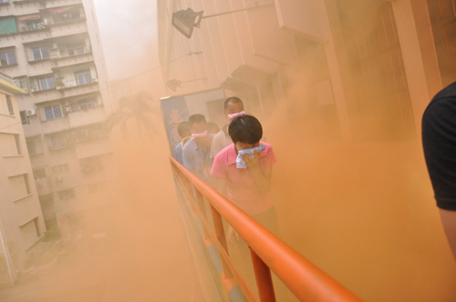 在闕教官講解相關(guān)消防知識(shí)和消防器材使用方法、傳授消防逃生應(yīng)變技能和自我保護(hù)技能及明確各演練職能小組職責(zé)和演練小組疏散路線之后,演練開始。滅火行動(dòng)組在得到演練命令后,立即發(fā)出火警訊號,并在各指定點(diǎn)放啟煙霧彈,樓梯道和走廊瞬間頓時(shí)濃煙滾滾。各演練組聽到逃生訊號后,在應(yīng)急疏散隊(duì)的組織下,按組分批迅速有序地從俱樂部二樓往一樓籃球場疏散撤離,每人用濕毛巾捂住嘴巴,彎腰匍匐前進(jìn),按規(guī)定的順序疏散,直到?jīng)_出煙區(qū)。