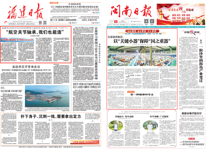 公司以國家安全為己任,自主研發(fā)全球領(lǐng)先的“三大核心技術(shù)”,突破國外技術(shù)和產(chǎn)品封鎖,助力實(shí)現(xiàn)我國“大飛機(jī)夢”。2023年6月14日《龍軸集團(tuán)自主研發(fā)出PTFE織物自潤滑襯墊,打破國外技術(shù)壟斷,助力國產(chǎn)大飛機(jī)“一飛沖天”——“航空關(guān)節(jié)軸承,我們也能造”》榮登《福建日報》頭版頭條,并獲新華網(wǎng)推介;6月25日《閩南日報》頭版頭條專題報道《龍溪軸承集團(tuán):以“關(guān)鍵小器”保障“國之重器”》;獲評漳州市“突出工業(yè)、突破工業(yè)”十件大事。