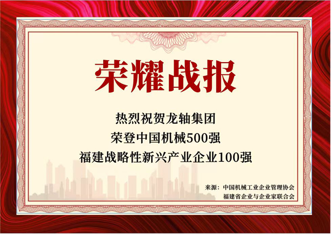 公司以雄厚的規(guī)模力、出色的效率力、強(qiáng)大的成長力和豐富的資源力再度獲評中國機(jī)械500強(qiáng)、福建戰(zhàn)略性新興產(chǎn)業(yè)企業(yè)100強(qiáng),已連續(xù)16年上榜中國機(jī)械500強(qiáng),連續(xù)4年上榜福建戰(zhàn)略性新興產(chǎn)業(yè)企業(yè)100強(qiáng)。
