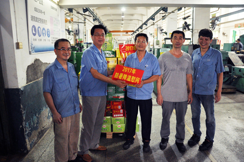 ????2017年8月21日下午,公司黨委書(shū)記董事長(zhǎng)曾凡沛、總經(jīng)理陳晉輝、副總經(jīng)理張逸青、工會(huì)主席康安偉一行前往金田公司鍛工車間、車工一車間、車工二車間、成品五車間、熱處理車間等生產(chǎn)現(xiàn)場(chǎng)慰問(wèn)堅(jiān)守崗位的職工,并送去涼茶、菊花茶、冬瓜茶等防暑降溫物品,讓他們?cè)谘籽紫娜罩懈惺艿疥囮嚽鍥觥?