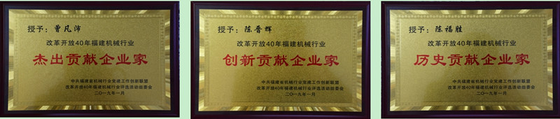 2019年1月30日,改革開(kāi)放40年福建機(jī)械行業(yè)杰出貢獻(xiàn)企業(yè)家表彰大會(huì)在福州隆重召開(kāi)。公司黨委書(shū)記、董事長(zhǎng)曾凡沛獲改革開(kāi)放40年福建機(jī)械行業(yè)杰出貢獻(xiàn)企業(yè)家殊榮;公司黨委副書(shū)記、總經(jīng)理陳晉輝獲改革開(kāi)放40年福建機(jī)械行業(yè)創(chuàng)新貢獻(xiàn)企業(yè)家殊榮;原公司黨委書(shū)記、董事長(zhǎng)陳福勝獲改革開(kāi)放40年福建機(jī)械行業(yè)歷史貢獻(xiàn)企業(yè)家殊榮。