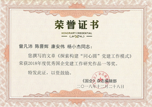 近日,《國企》雜志編輯部依據(jù)文章主題、文字闡述等質量評審要素,對刊載于2018年度《國企·黨建》雜志的文章進行評審,按黨建理論研究、工作研究、宣傳報道3大類評選出108篇優(yōu)秀作品。由公司黨委書記、董事長曾凡沛主持撰寫的《探索構建“同心圓”黨建工作模式》榮獲2018年度優(yōu)秀國企黨建工作研究作品一等獎。