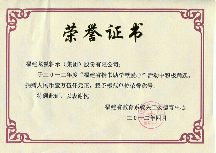 二O一二年度福建省捐書助學獻愛心活動模范單位證書