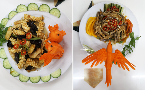 參賽隊員們自帶食材,各顯其能,動作嫻熟,有條不紊,盡顯烹飪能手的風采。十八支參賽隊共烹飪出了18道熱菜和18道冷菜的美味佳肴,他們還為每個菜品起了生動的名字,寓意不同,“荷荷美美”寓意家庭和美幸福;“魚躍龍門”彰顯著對職工、對企業(yè)的美好祝愿;“多彩人生”承載著每個職工對工作生活期盼。不僅創(chuàng)意新穎,而且色澤鮮美,味道純正,女工們用自己精心烹飪的美味佳肴互傳友誼,倡導和諧健康生活。